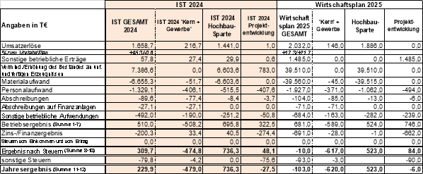 27. März 2024, 24-23379)) veranschlagte ein Ergebnis 2024 in Höhe von + 200,0 T€. Das Ergebnis 2024 liegt nunmehr bei rd. -27,5 T€. Grund hierfür ist hauptsächlich, dass die Honorarerlöse für den Schulneubau (als Teil der Stiftshöfe) bei den Umsatzerlösen der Sparte Hochbau verbucht werden. Daneben sind die Aufwendungen für die Stiftshöfe ertragswirksam bei den Bestandsveränderungen gegenzubuchen (s. o.). Der Nachtragswirtschaftsplan 2024 sah hierzu noch vor, dass dies in dieser Sparte als ‚Aktivierte Eigenleistungen‘ erfolgen soll. Dies hat jedoch keine Ergebnisauswirkung, sondern stellt nur eine buchungssystematische Änderung dar.