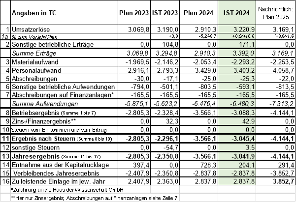 Die Verschlechterung des Ergebnisses 2024 gegenüber dem Vorjahresergebnis (- 175,0 T€) resultiert u. a. aus geringeren Fördermitteleinnahmen.