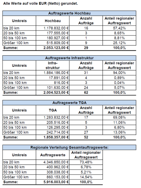 Insgesamt wurden rd. 73 % der Aufträge von lokal ansässigen Firmen mit Sitz in einem Umkreis von max. 20 km um Braunschweig abgewickelt. Insbesondere während der Betriebsphase ist die Einbindung lokaler Firmen für die Gewährleistung kurzer Reaktionszeiten und die Umsetzung der vertraglich geschuldeten Leistungen von hoher Bedeutung.