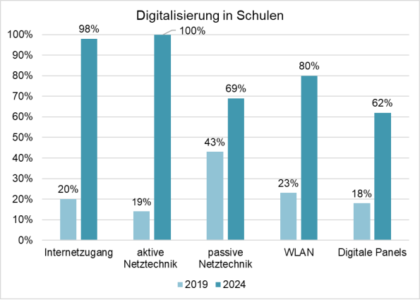 Aus der nachstehenden Grafik sind die Fortschritte von 2019 bis 2024 (Laufzeit der dritten Fortschreibung des MEP inkl. Digitalpakt Schule) ersichtlich: