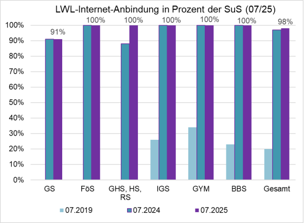 Der Anteil der mit Glasfaser (LWL-Internet-Anbindung) versorgten Schülerinnen und Schüler (SuS) nach Schulformen ist aus der nachstehenden Grafik ersichtlich: