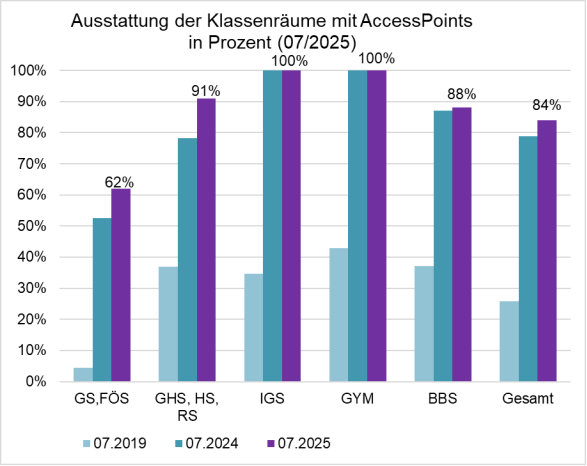 Wie aus der nachstehenden Grafik ersichtlich ist, konnten insgesamt 84 Prozent der Klassenräume mit WLAN (AccessPoints) versorgt werden: