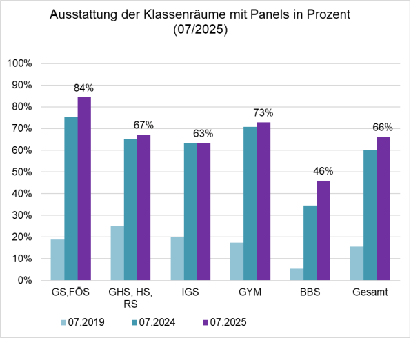 Aus dem nachstehenden Diagramm ist ersichtlich, dass 66 Prozent aller unterrichtsrelevanten Räume mit digitalen Panels ausgestattet sind.