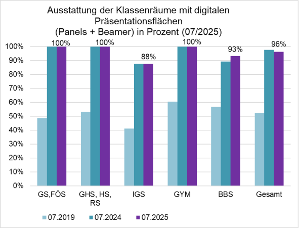 Werden Panels und Beamer zusammengezählt (siehe Abb. 6), zeigt sich, dass aktuell insgesamt 96 Prozent der Unterrichtsräume über digitale Präsentationsmöglichkeiten verfügen.