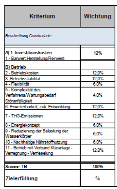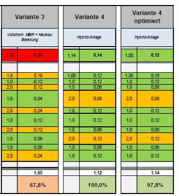 Die aktualisierte Bewertung erfolgt anhand der gleichen Kriterien und Wichtungen wie in der Machbarkeitsstudie. Die Auswertung der Bewertungsmatrix zeigt, dass die neu entwickelte Variante 4 (Hybrid-Anlage) die beste Zielerfüllung erreicht. Dabei schneidet diese Variante bei den meisten Kriterien am besten ab und hat vor allem bei den höher gewichteten Kriterien Vorteile gegenüber den anderen Varianten. Die Analyse zeigt im Rahmen des derzeitigen Planungsstands eine annähernd gleichwertige Zielerfüllung der Variante 4 (100 %) und Variante 4-optimiert (97,8 %). Bei zusätzlicher Betrachtung des Investitionskostenbarwertes ist die optimierte Variante 4, trotz der leicht höheren Betriebskosten, im gesamten Betrachtungszeitraum die wirtschaftlichste Variante und somit unter Einbezug der hohen Zielerfüllung von 97,8 % in der Gesamtbetrachtung die neue festgelegte Vorzugsvariante.