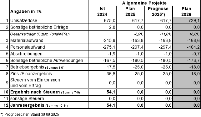 Die Planung für das Jahr 2026 fällt im Vergleich zum Vorjahr etwas schlechter aus. Bei den Aufwendungen sind insbesondere im Bereich des Materialaufwandes (+86,4 T€) sowie bei den Personalkosten (+61,7 T€) Steigerungen erkennbar. Diese resultieren im Wesentlichen aus gestiegenen Honorarkosten sowie aus Anpassungen aufgrund von geplanten Tariferhöhungen, Stufenerhöhungen durch die Dauer der Betriebszugehörigkeit und steigenden Beiträgen zur betrieblichen Altersvorsorge.